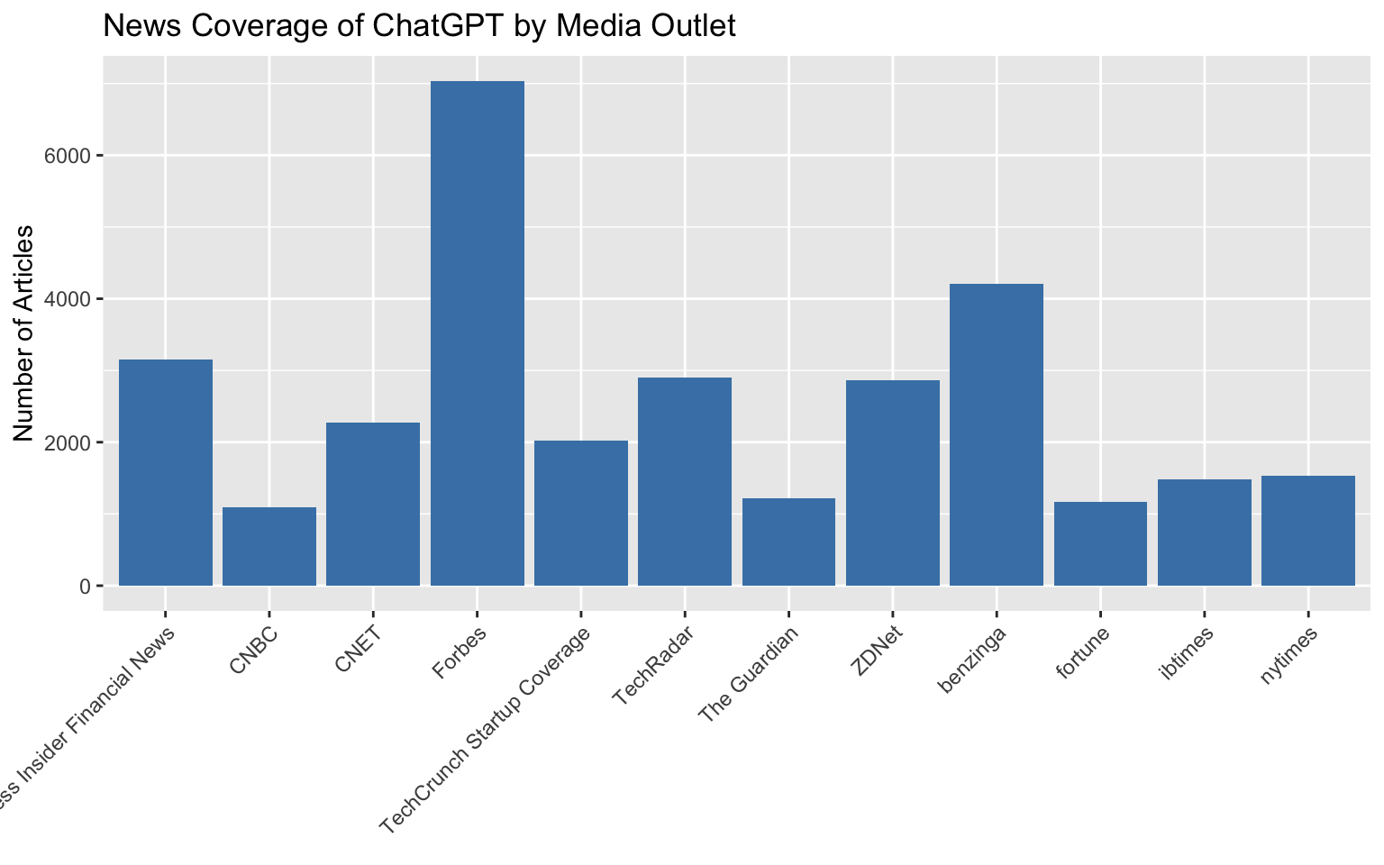 ggplot(outlet_summary, aes(y = n_articles, x = outlet_label)) +geom_col(fill ="steelblue") +labs(title ="News Coverage of ChatGPT by Media Outlet",y ="Number of Articles",x =NULL ) +theme(axis.text.x =element_text(angle =45, hjust =1, vjust =1))