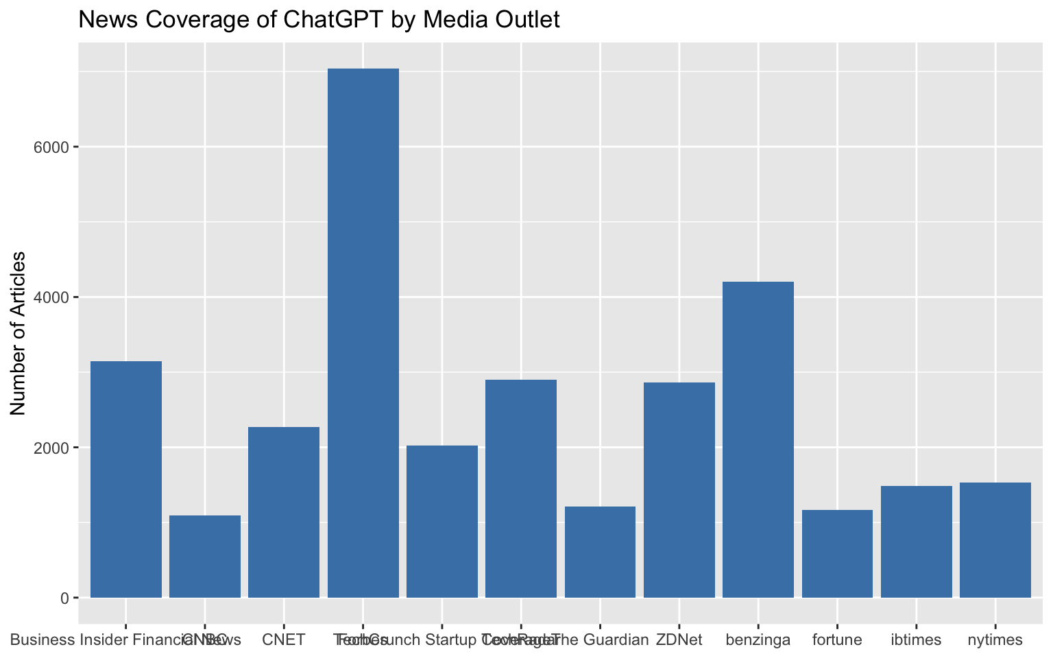ggplot(outlet_summary, aes(y = n_articles, x = outlet_label)) +geom_col(fill ="steelblue") +scale_x_discrete(labels = scales::label_wrap(15)) +labs(title ="News Coverage of ChatGPT by Media Outlet",y ="Number of Articles",x =NULL )