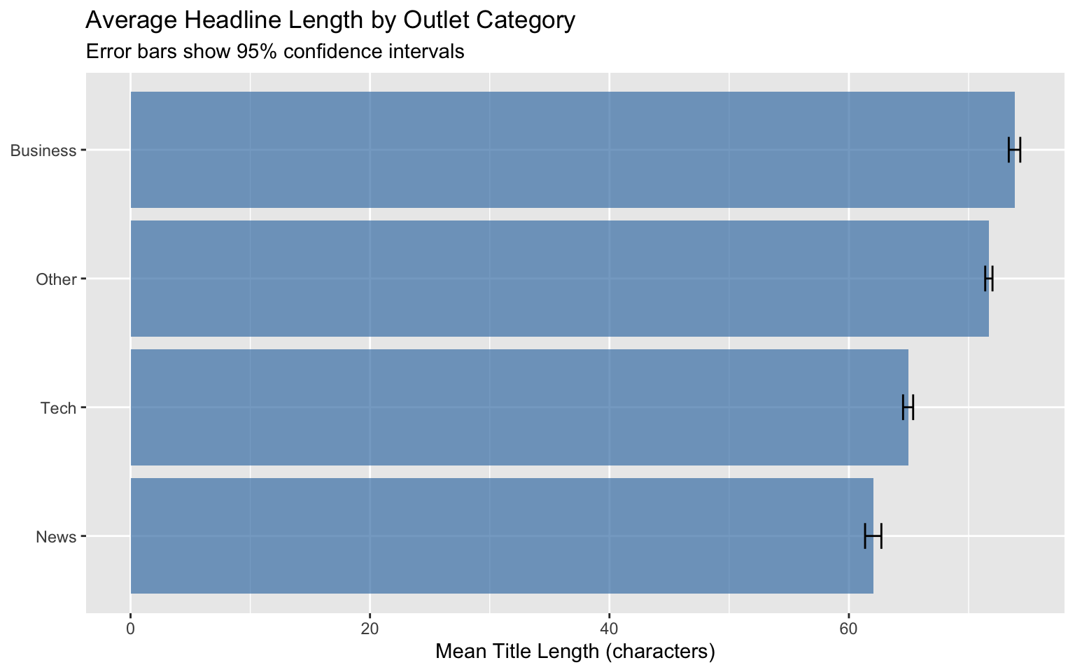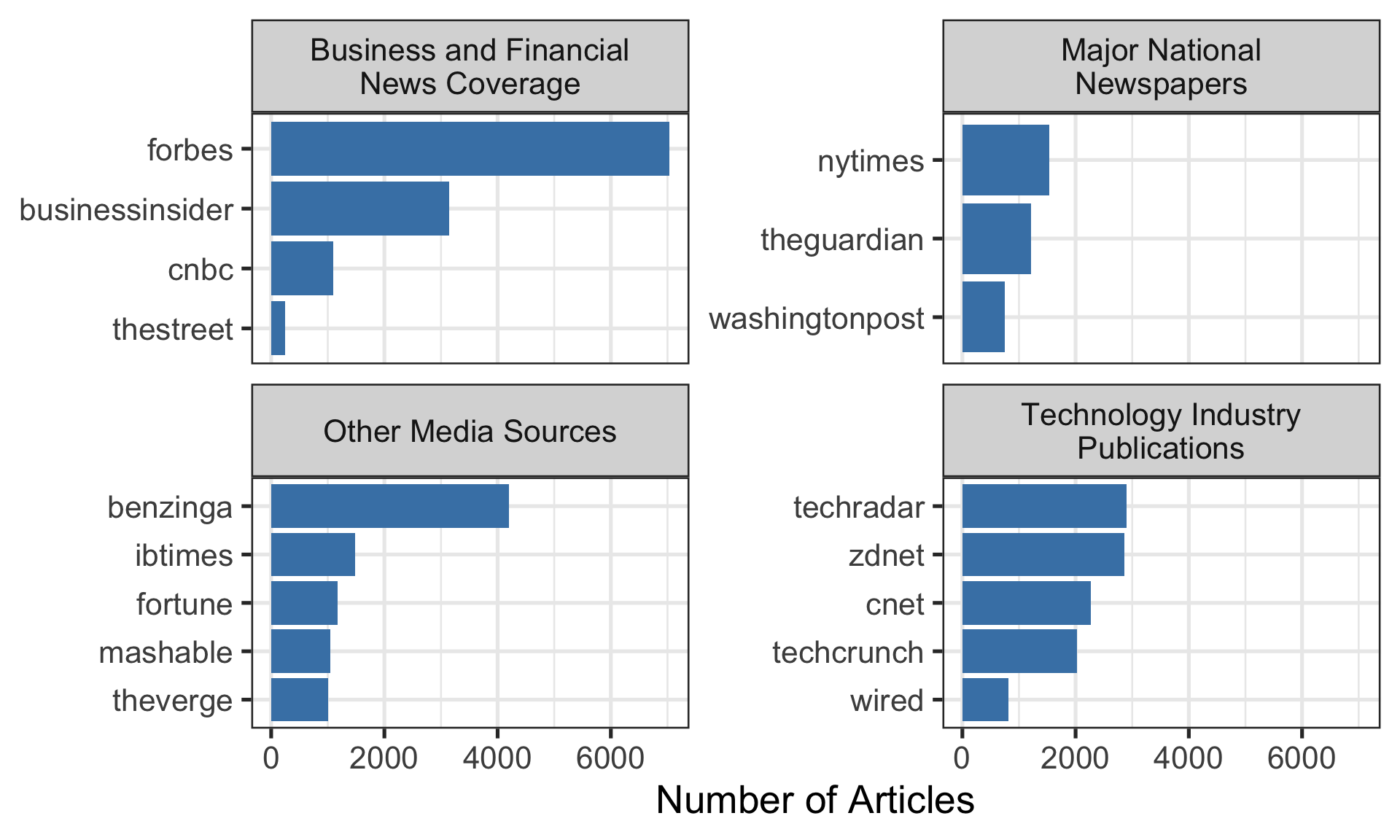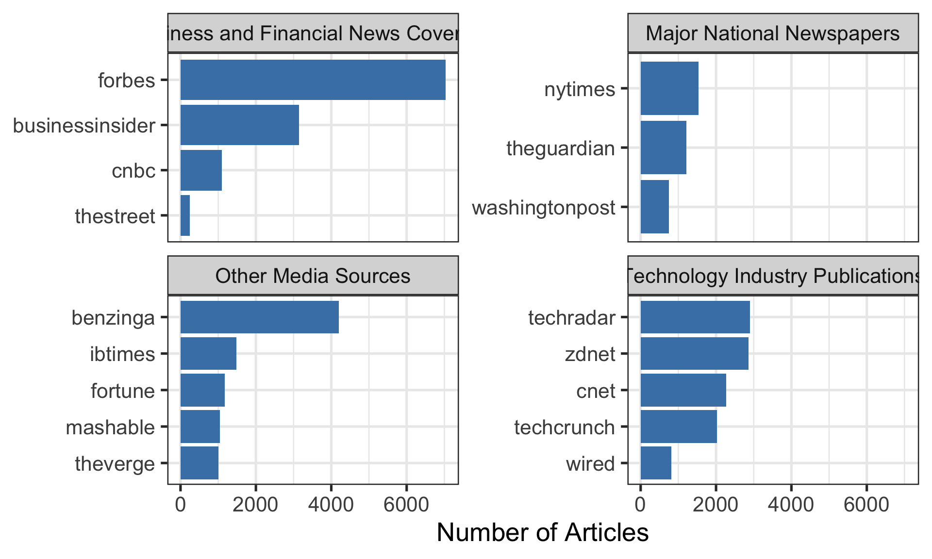 # Create data with long category names for facetingoutlet_by_category <- headlines %>%mutate(outlet =str_remove(media_url, "\\.com$|\\.org$|\\.net$")) %>%mutate(category =case_when( outlet %in%c("forbes", "businessinsider", "cnbc", "thestreet") ~"Business and Financial News Coverage", outlet %in%c("techcrunch", "zdnet", "cnet", "techradar", "wired") ~"Technology Industry Publications", outlet %in%c("theguardian", "nytimes", "washingtonpost") ~"Major National Newspapers",TRUE~"Other Media Sources" ) ) %>%count(category, outlet) %>%group_by(category) %>%slice_max(n, n =5)