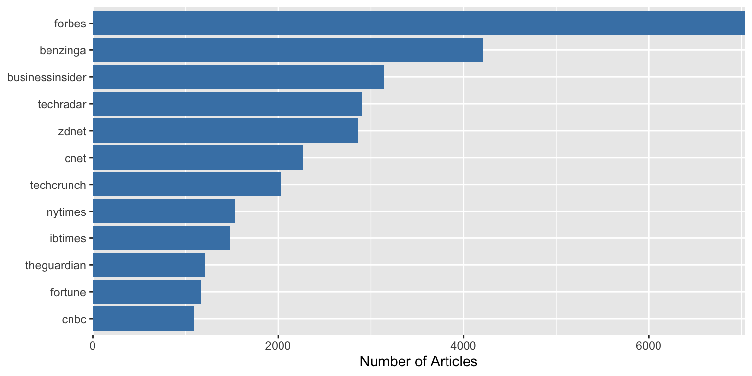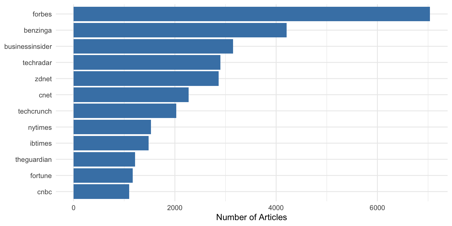 ggplot(outlet_summary, aes(x = n_articles, y =reorder(outlet, n_articles))) +geom_col(fill ="steelblue") +theme_minimal() +theme(panel.grid.major.y =element_blank(),panel.grid.minor =element_blank() ) +labs(x ="Number of Articles", y =NULL)