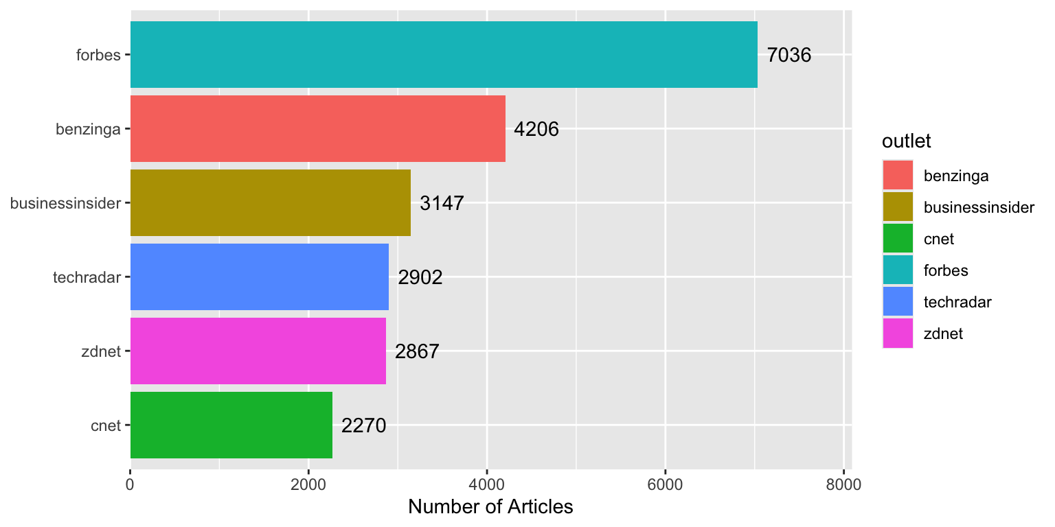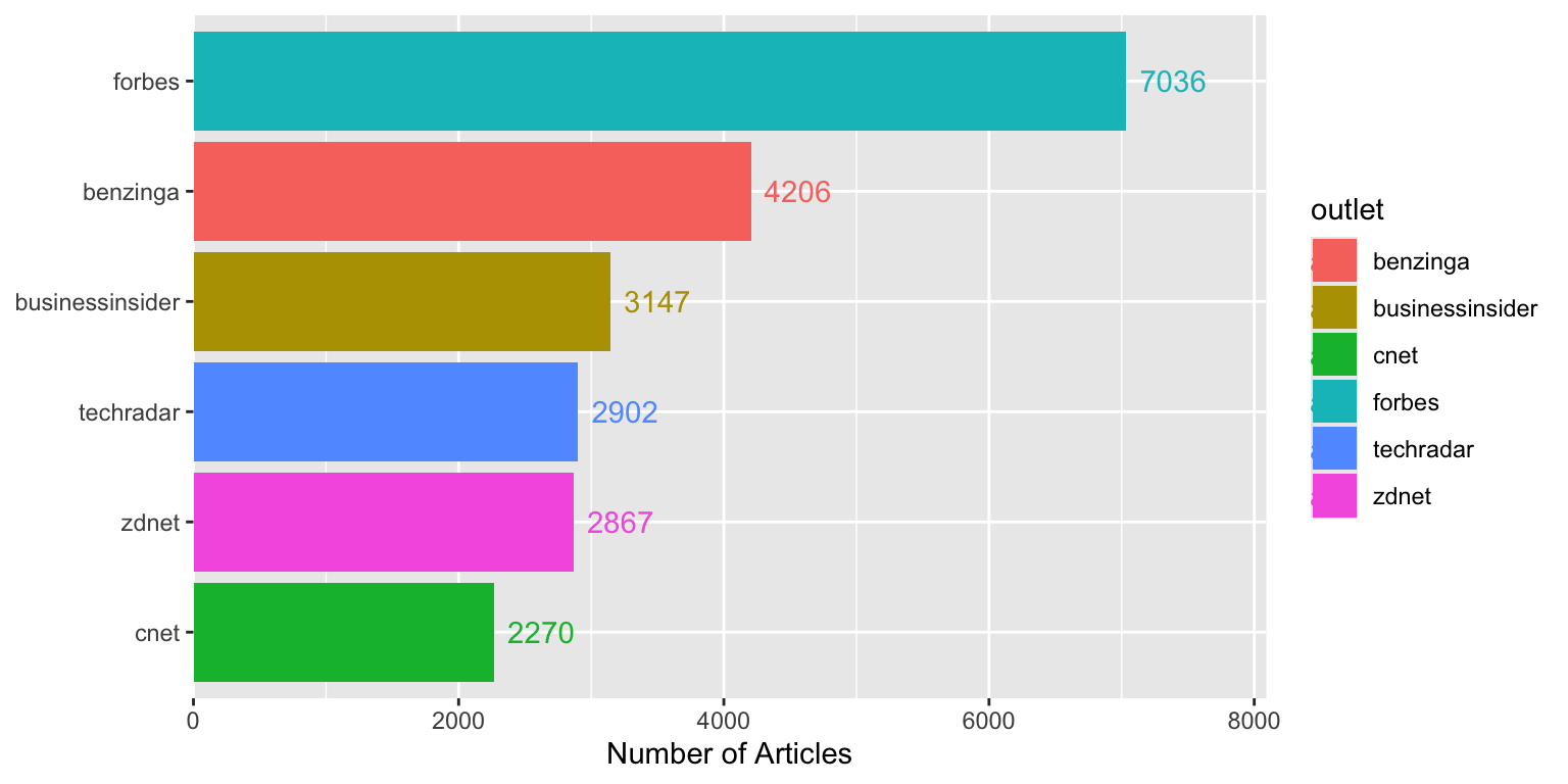 ggplot(top_outlets, aes(x = n_articles, y =reorder(outlet, n_articles), fill = outlet)) +geom_col() +geom_text(aes(label = n_articles), hjust =-0.2, show.legend =FALSE) +scale_x_continuous(expand =expansion(mult =c(0, 0.15))) +labs(x ="Number of Articles", y =NULL)