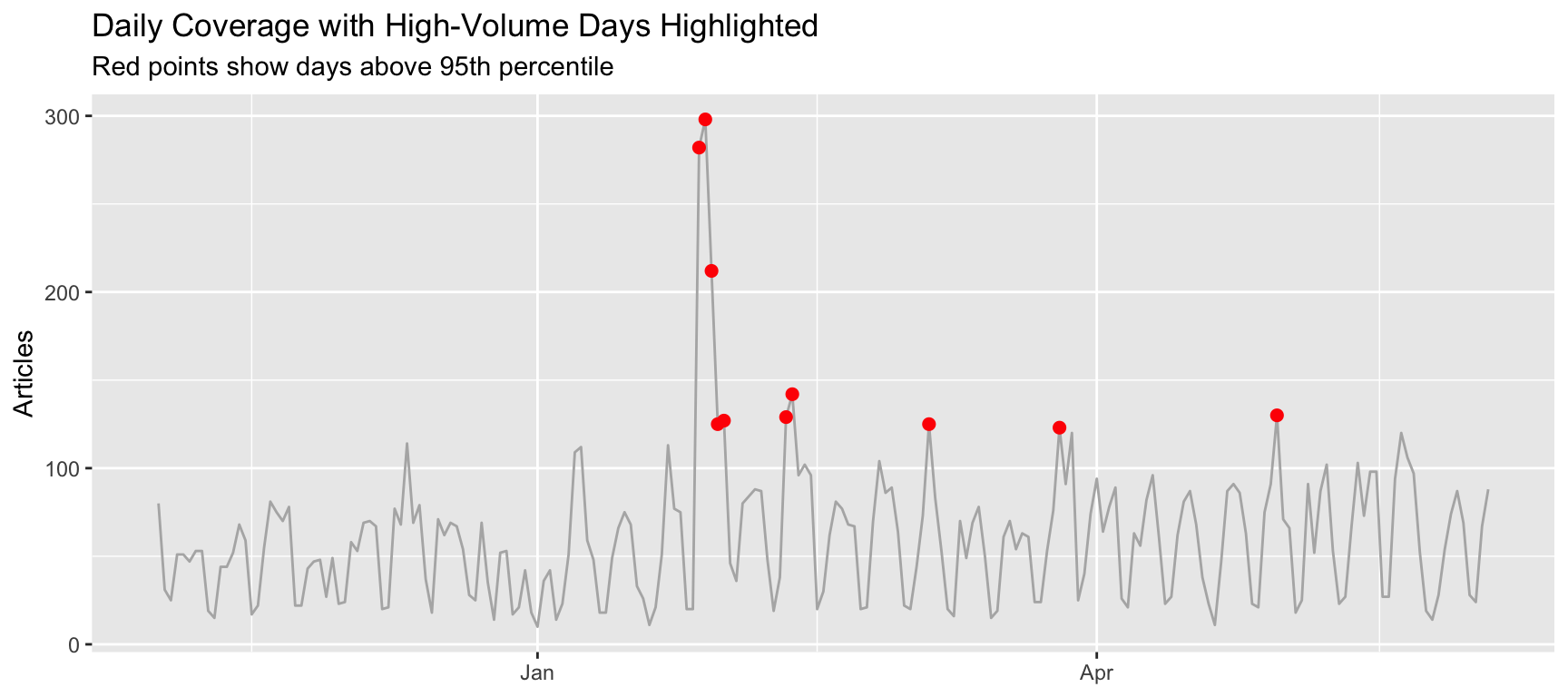 # Parse dates and count by daydaily_counts <- headlines %>%mutate(date =mdy(publish_date) ) %>%filter(!is.na(date), date >="2024-11-01") %>%count(date, name ="n_articles")head(daily_counts)