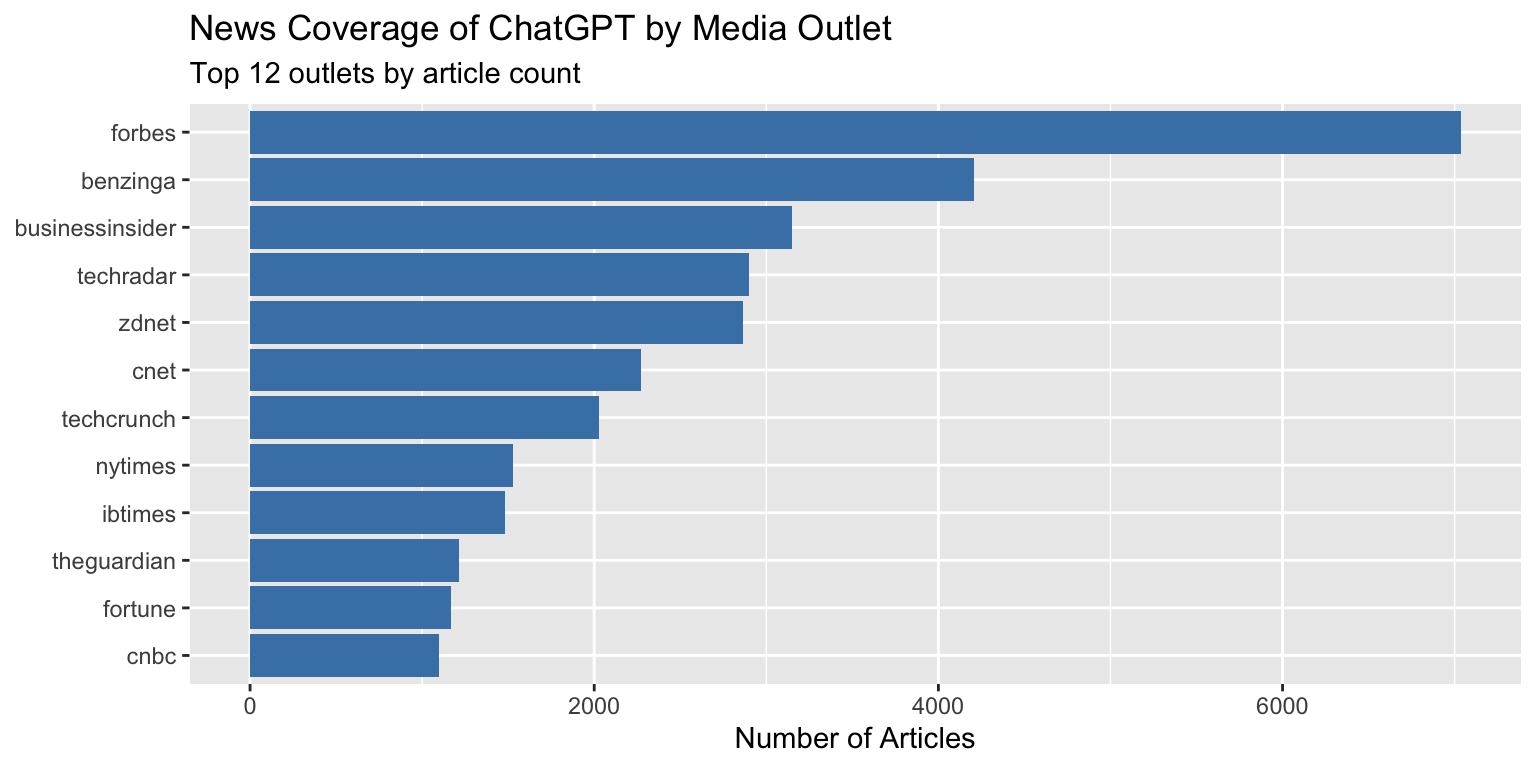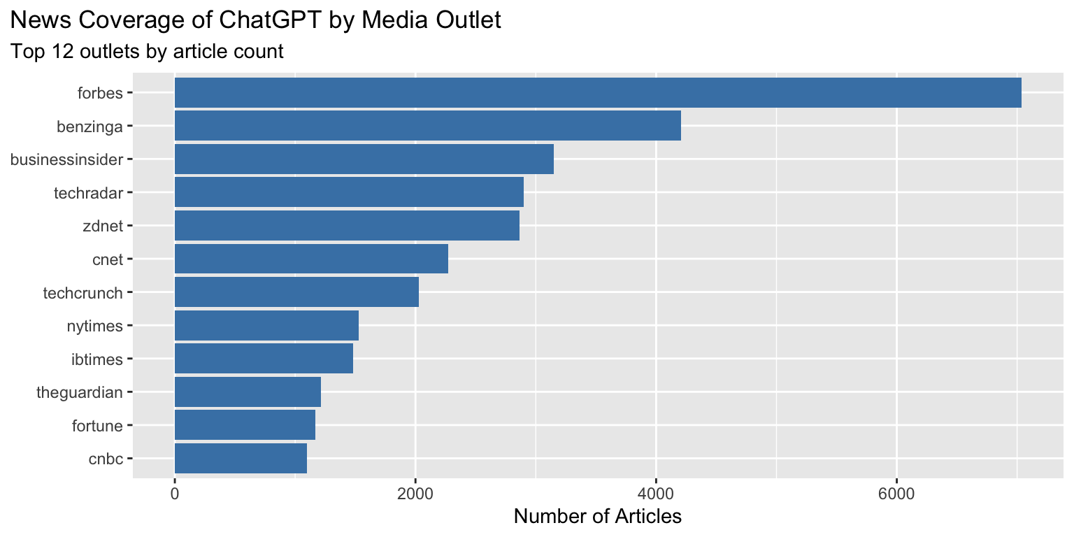 library(tidyverse)library(scales)# Load the headlines dataheadlines <-read_csv("data/mc-onlinenews-mediacloud-20250604193447-chatgpt-headlines.csv")# Create a summary: count articles by media outletoutlet_summary <- headlines %>%mutate(outlet =str_remove(media_url, "\\.com$|\\.org$|\\.net$")) %>%count(outlet, name ="n_articles") %>%slice_max(n_articles, n =12) %>%mutate(outlet_label =case_when( outlet =="theguardian"~"The Guardian", outlet =="forbes"~"Forbes", outlet =="cnet"~"CNET", outlet =="techcrunch"~"TechCrunch Startup Coverage", outlet =="zdnet"~"ZDNet", outlet =="businessinsider"~"Business Insider Financial News", outlet =="techradar"~"TechRadar", outlet =="theconversation"~"The Conversation", outlet =="cbsnews"~"CBS News", outlet =="cnbc"~"CNBC", outlet =="reuters"~"Reuters",TRUE~ outlet ) )# Preview the dataoutlet_summary