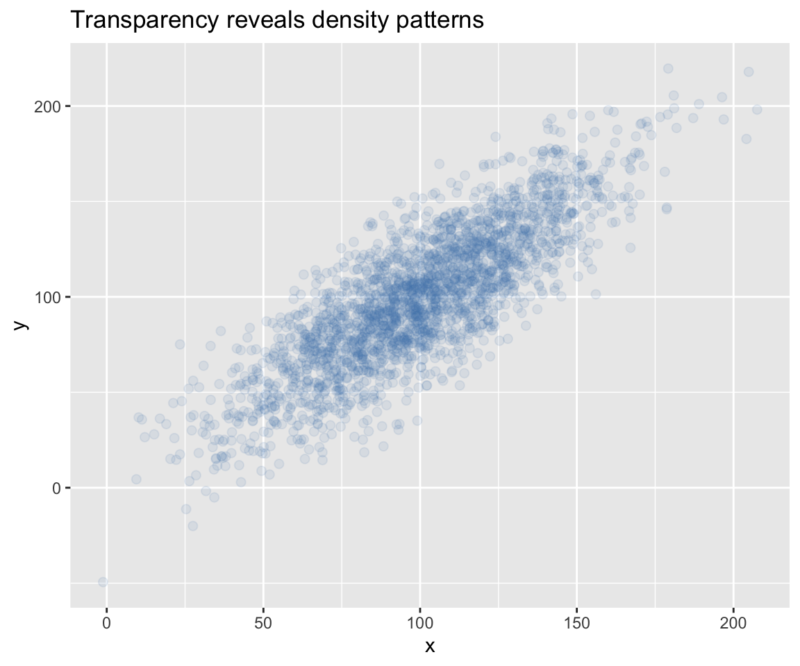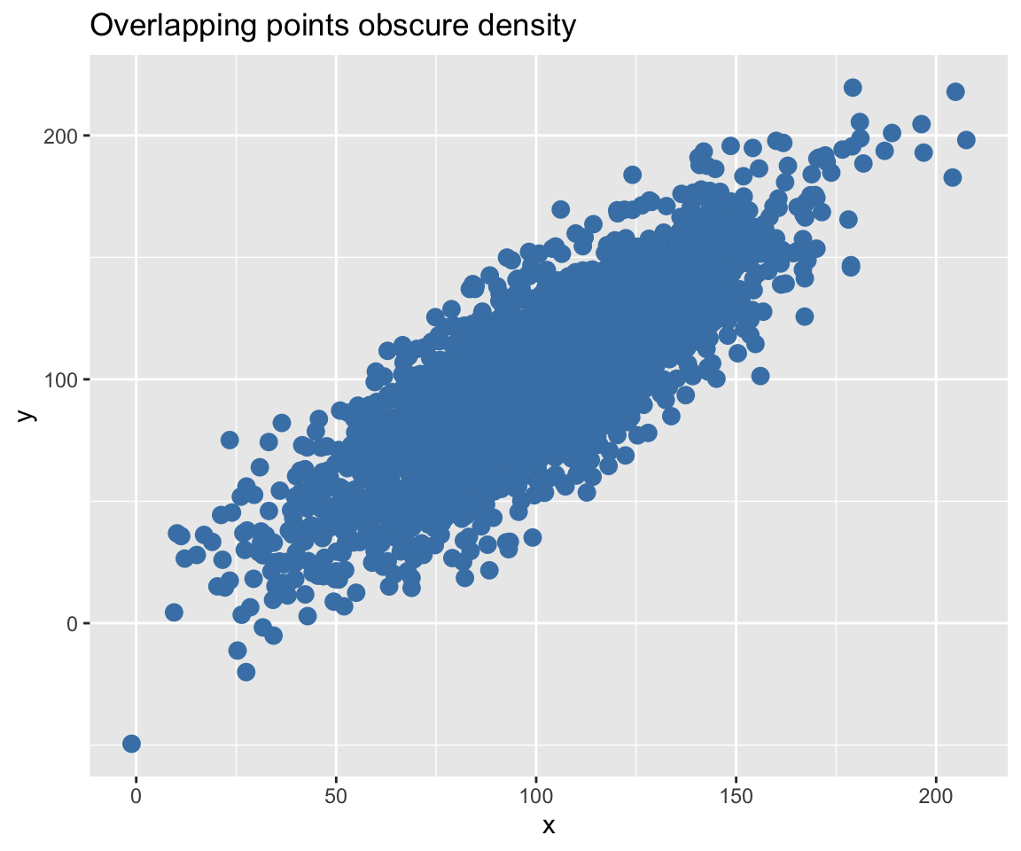 # Create some overlapping dataset.seed(42)scatter_data <-tibble(x =rnorm(2500, mean =100, sd =30),y = x +rnorm(2500, mean =0, sd =20))